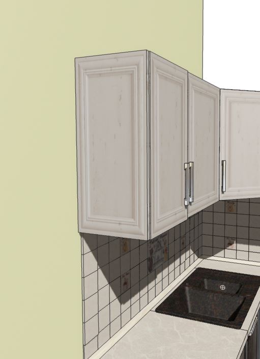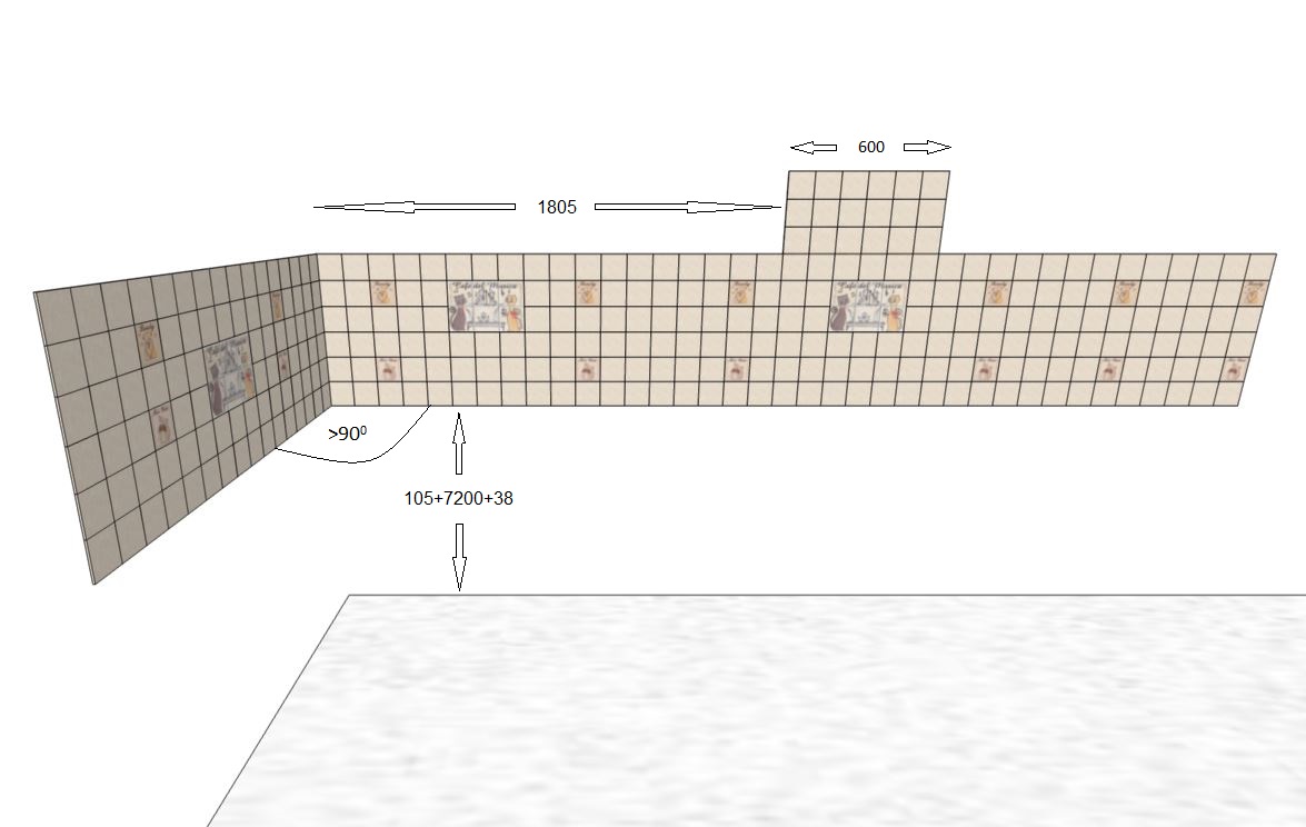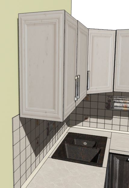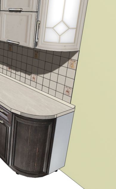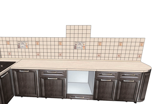 2. Если ремонт помещения производится до установки кухонного гарнитура. - Постарайтесь не клеить плитку под вытяжкой (шкафом для вытяжки) до монтажа верхних шкафов. Неровность угла, допуски при изготовлении и сборке шкафов могут привести к тому, что общая ширина шкафов окажется больше или меньше расчетной фартука. В обоих случаях с одной стороны шкаф будет накладываться на плитку, с другой образовывать щель. - При отсутствии возможности доклеить плитку после монтажа шкафов нудно приготовиться к точному расчету расположения шкафов с началом их монтажа от плитки под вытяжкой или планировать монтаж шкафов с нахлестом на плитку. на анимированном фото порядок установки шкафов в разных вышеописанных случаях 3. Если ширина фартука меньше ширины столешницы - окончание плинтуса повиснет между столешницей и пустотой за ней (см фото 1). Если ширина фартука больше ширины столешницы - плинтус будет установлен правильно, но между верхним торцевым шкафом и стеной образуется щель на глубину фартука, которую нельзя закрыть декоративной панелью, т.к. выступающий фартук будет мешать расположению декоративной панели на стене. Во всех случаях установки фартука раньше гарнитура возникнут проблемы с его установкой. Вероятность совпадения размеров менее 1%. Лучше соблюсти последовательность (см. п. 1).
