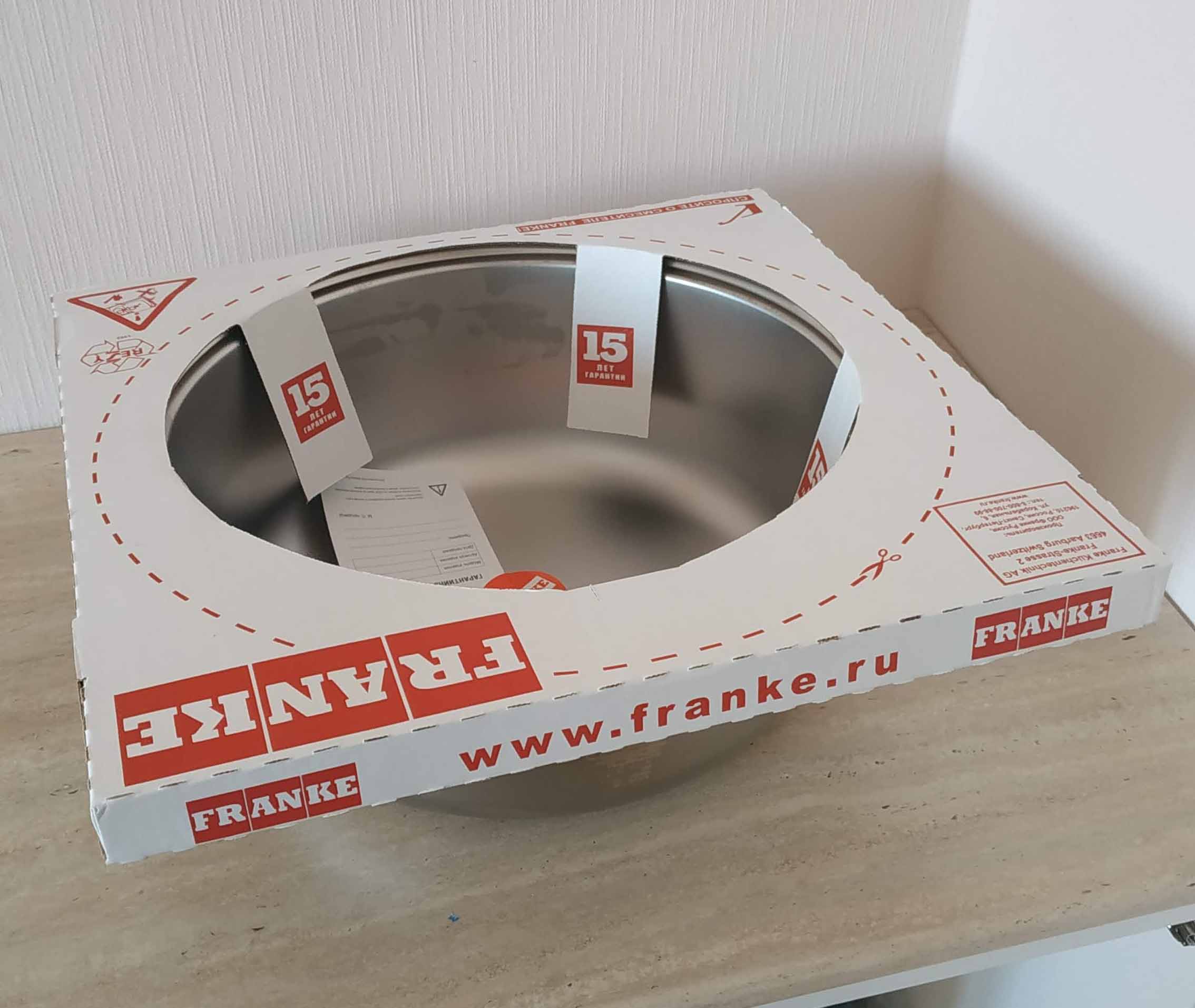 6. Производитель и качество. При покупке кухонного гарнитура и его составляющих вы можете экономить на чем угодно, только не на мойке. Установка мойки и смесителя ненадлежащего качества или с нарушением технологии приведет к скорому разрушению гарнитура (во всяком случае нижней его части). Обращайте внимание на качество изделия и отзывы потребителей и никогда не слушайте советы продавцов-консультантов. Фото распаковки "любимой" мной мойки FRANKE RON 610-38: