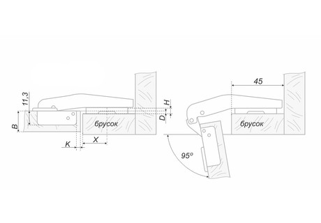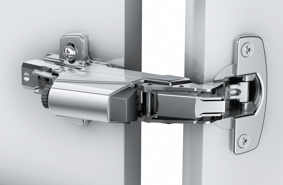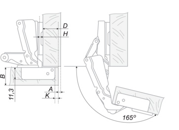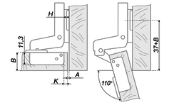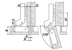 Данный тип петли позволяет навесить два фасада на одной стенке шкафа в разные стороны (пример на схеме). Вкладная петля