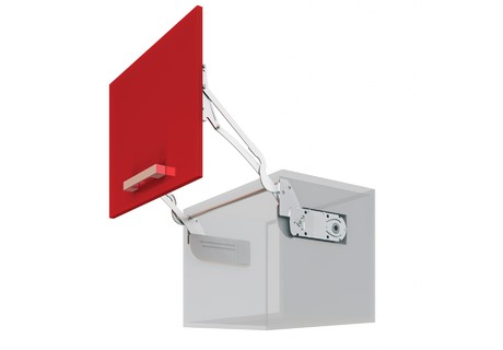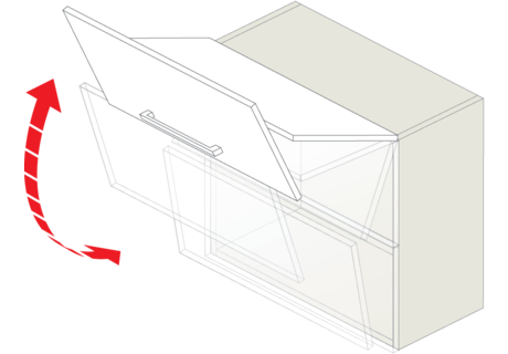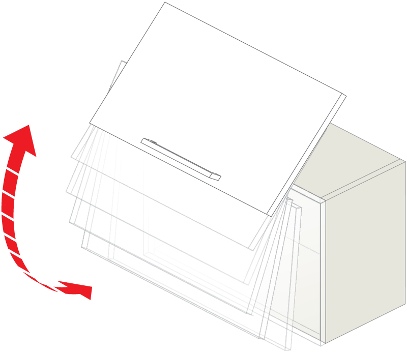 Откидная система LOFT Фасад с системой LOFT открывается одним движением строго вверх, поэтому этот подъемный механизм требует достаточного пространства над гарнитуром. Как и другие механизмы серии AERO, LOFT дает полный доступ к содержимому шкафа. Фасад при открывании фиксируется в каждой точке траектории его хода, а подъемный механизм оснащен амортизатором для мягкого и плавного закрывания.