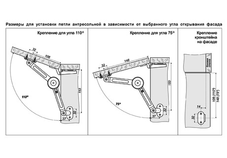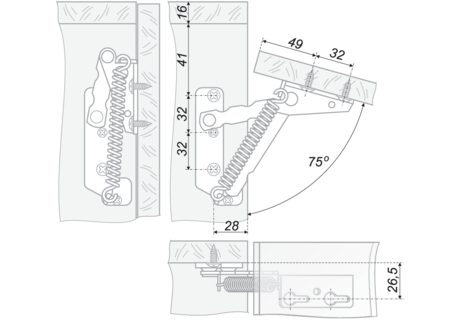 Петля антресольная 1 Петля антресольная, комплект левая L и правая R. Используется для дверей, открывающихся вверх. Конструкция снабжена пружиной, за счёт которой дверь открывается и фиксируется в закрытом и открытом положении. Угол открывания 75 градусов. Применение данного типа антресольной петли не требует установку петель на фасад.