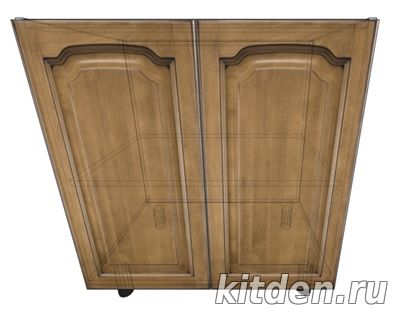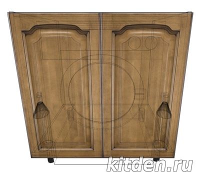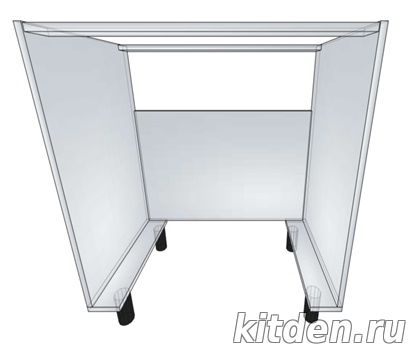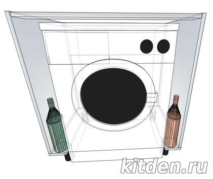Средняя высота стиральной машины составляет ≈ 850 мм, а высота столов под столешницей 820-830 мм. Для размещения стиральной машины в гарнитуре под столешницей понадобится приобретение комплектов ножек 150 мм для всех столов гарнитура (взамен стандартных 100 мм). Некоторые модели стиральных машин имеют съемную верхнюю крышку, после снятия которой, высота стиральной машины составляет ≈ 820 мм. При установке стиральной машины появляется желание спрятать ее за фасадами гарнитура. Решений этой идеи два: навеска фасадов на стенки столов, между которыми находится стиральная машина или ее установка в стол большего размера. Есть в этом решении одна проблема: фронтальная часть стиральной машины будет расположена на расстоянии ≈ 75 мм от края столешницы из-за чего пользоваться лотком для моющих средств будет невозможно. Решение №1: Навеска фасадов на боковые стенки соседних столов. Такое решение имеет массу проблем: - применение накладных петель потребует изготовление накладок на боковые стенки соседних шкафов, что увеличит установочный размер и повлечет за собой применение нестандартного размера фасадов (2х350мм):