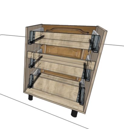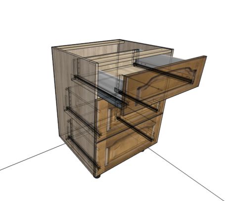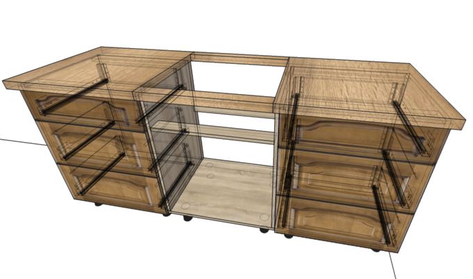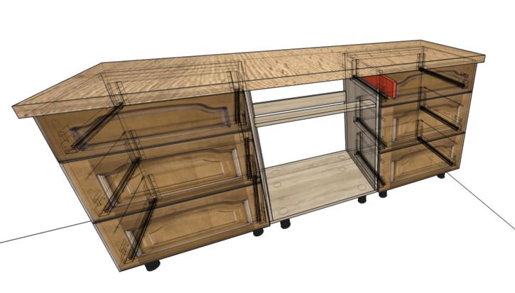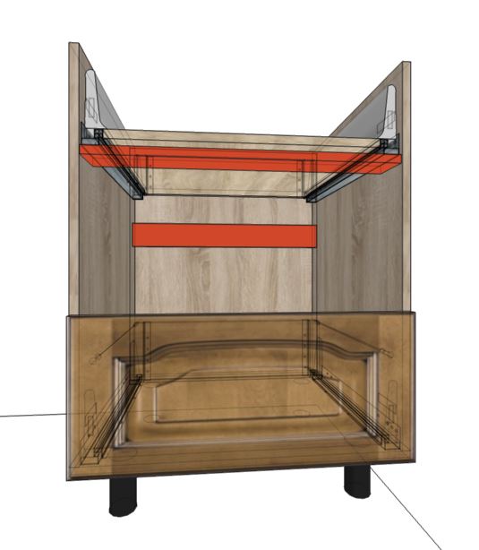 Царги стола изначально расположены горизонтально и прикреплены в корпусу. Крепления царг будет мешать производству пропила и установке варочной поверхности в столешницу. Для устранения препятствий ближнюю царгу устанавливаем под направляющие верхнего ящика,а дальнюю царгу вертикально вдоль задней стенки стола: